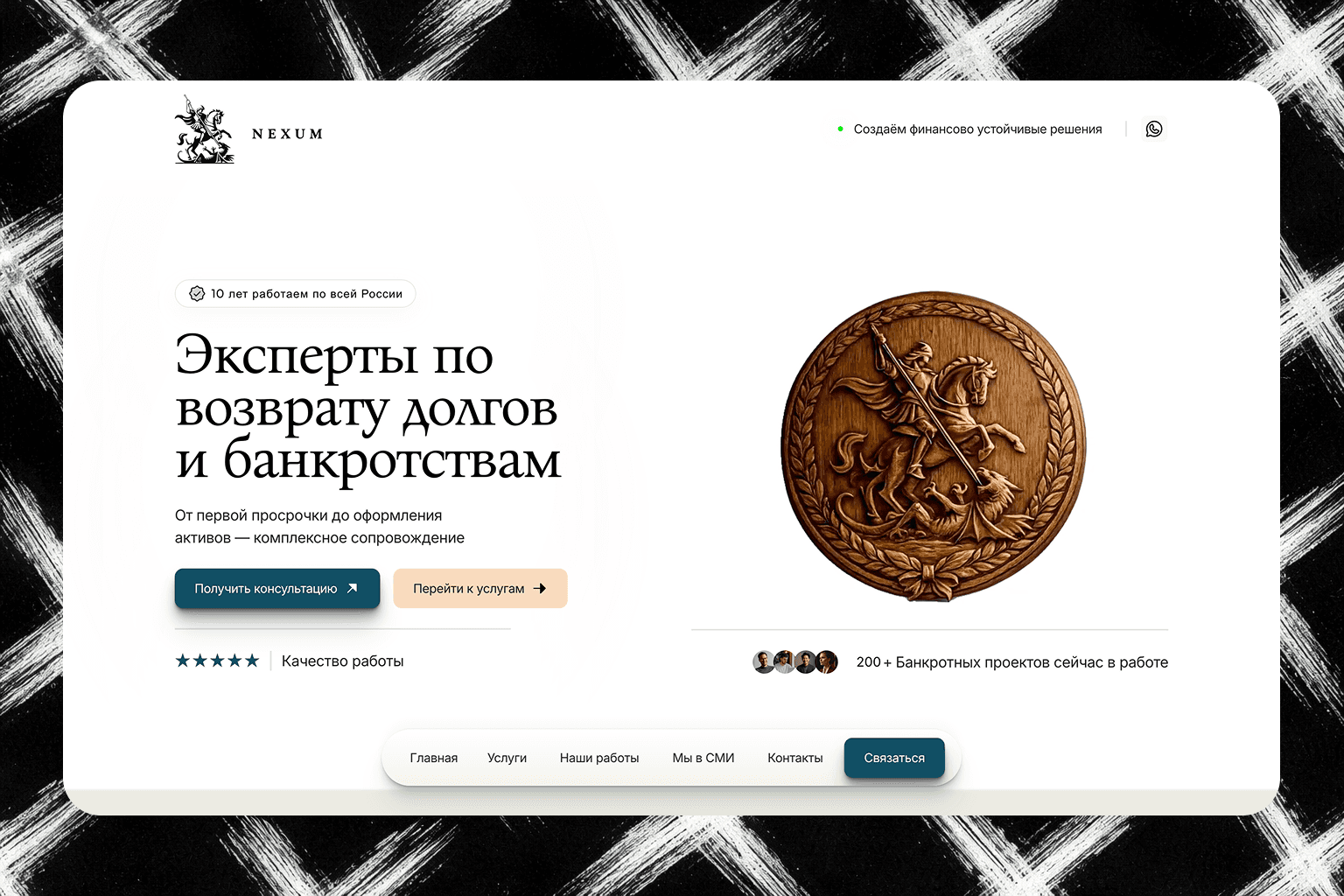 Nexum — юридическая компания из Краснодара, специализирующаяся на сопровождении банкротства юридических лиц, защите активов и работе с субсидиарной ответственностью. В штате порядка 10 специалистов. Работают с B2B-сегментом: собственники и директора строительных и торговых компаний, корпоративные юристы, кредиторы.