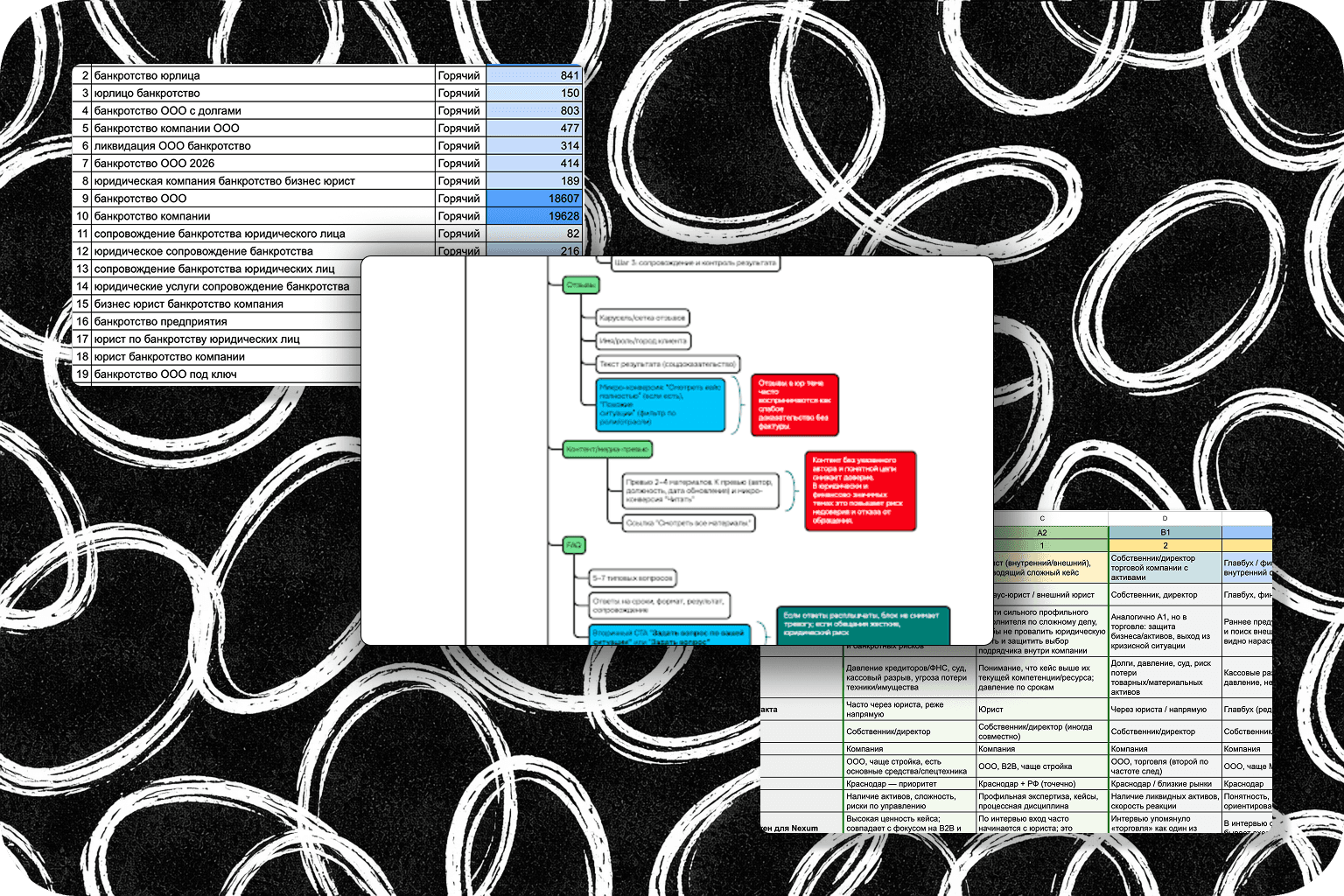 Выделили 6 сегментов аудитории, ранжировав их по приоритету: собственники компаний-должников, генеральные директора, корпоративные юристы, кредиторы (банки и контрагенты), арбитражные управляющие, партнёрские юридические практики, нуждающиеся в субподряде по банкротным делам